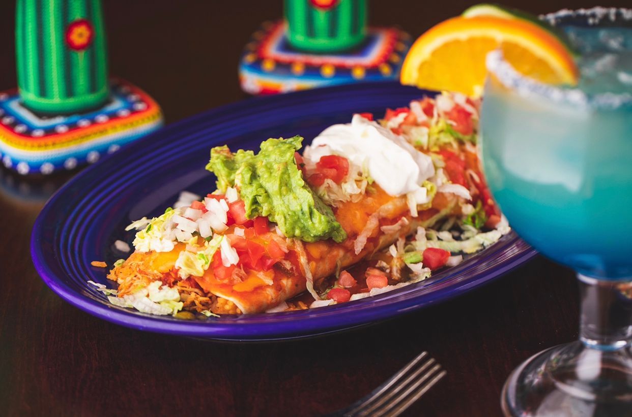 Large Crispy flour tortilla stuffed with delicious ground beef, cheddar and Monterrey jack cheese, Topped with tomatoes, onions, sour cream and guacamole,